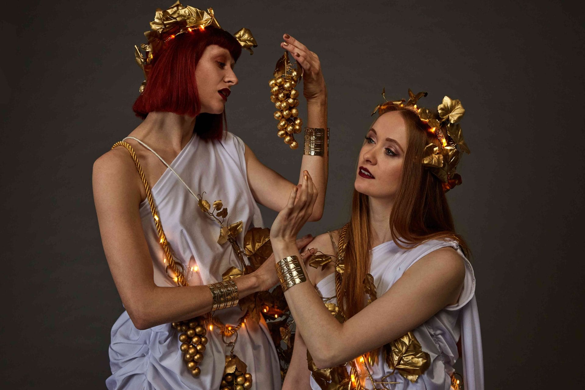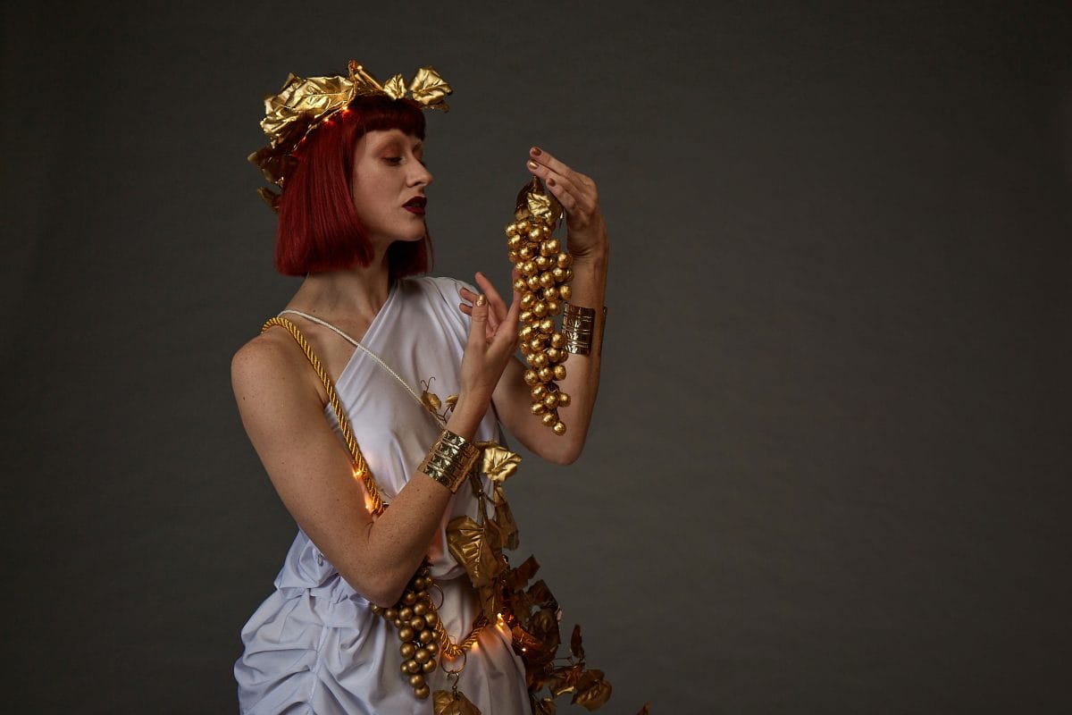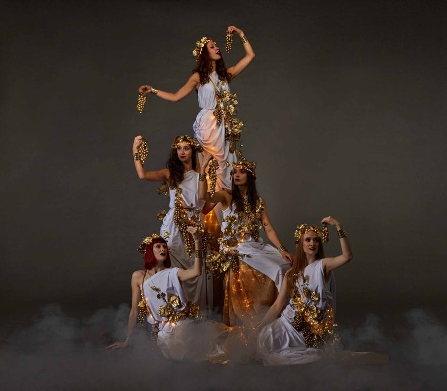 This exquisite act features performers draped in elegant robes and golden vines, adorned with gleaming clusters of chocolate grapes.