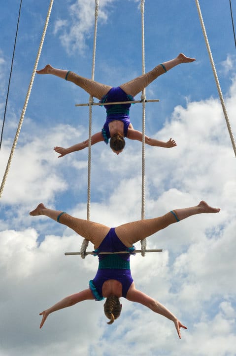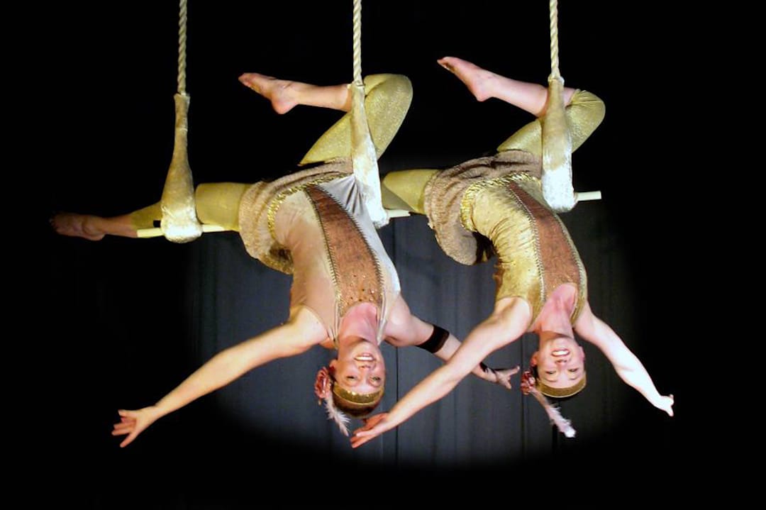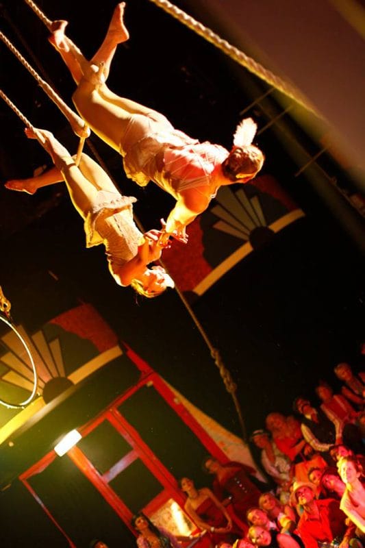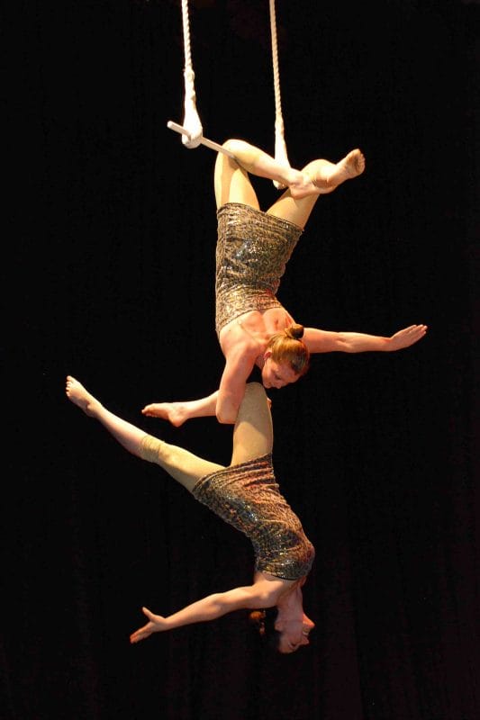They can perform a variety of unique double trapeze acts on several unusual trapezes: the dramatic ‘three-high’ trapeze, the popular ‘twin bar’ trapeze and the classic ‘single-bar’ trapeze. Their acts are themed as either 1920s flapper girls or vintage circus.