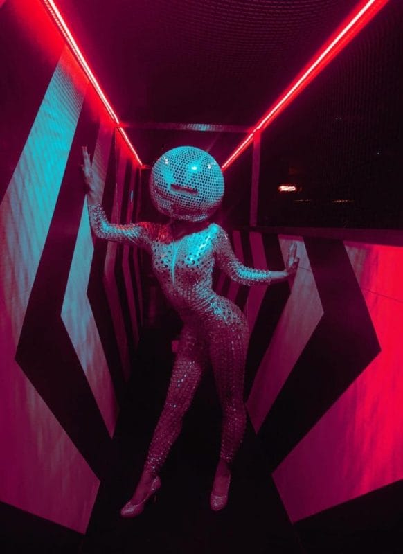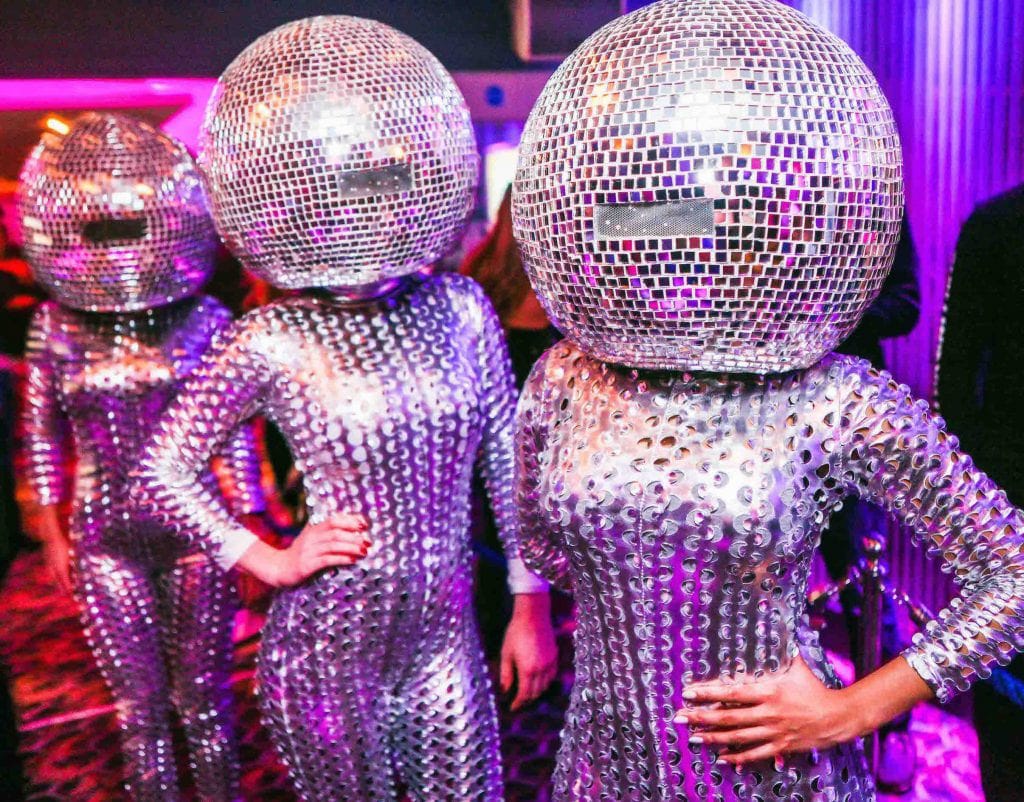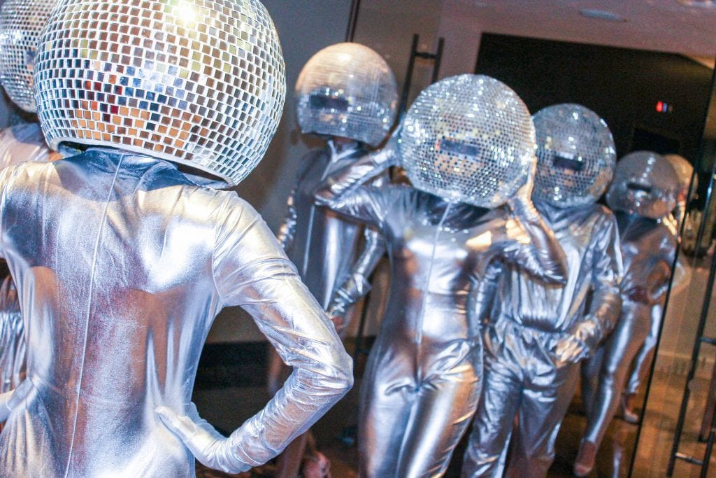 Dressed in silver spandex suits and topped with dazzling, oversized disco ball heads, our performers create a stunning visual impact.