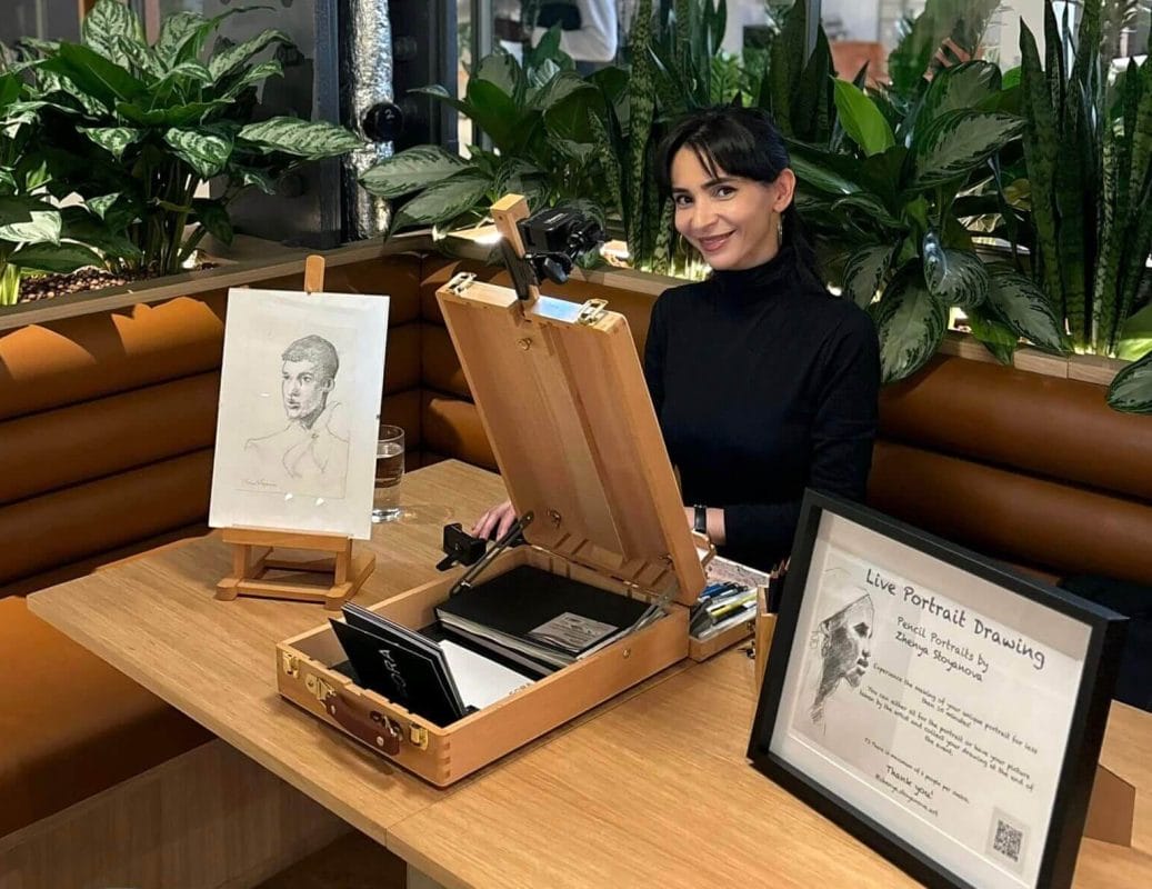 At events, Zhenya crafts speed portraits of guests, providing them with instant, personalised artwork as a memorable souvenir. This experience not only offers stunning art but also creates a deeper connection between the artist and the guest. Whether with pencils or digital media, Zhenya’s portraits capture the individuality and character of each person with expressive, elegant brush strokes. The portraits can be done in black and white or colour, and the artist interacts with guests, making the moment special and unforgettable.
