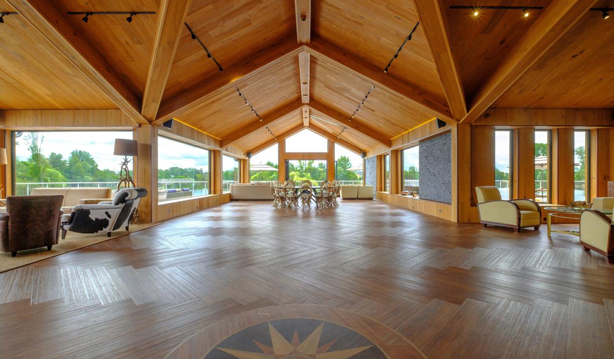 This hidden gem of 120 acre fishing lakes set within a private nature reserve centres around Amber Lodge, a Scandinavian lodge inspired venue perfect for events. Natural daylight floods the space through floor-to ceiling windows framing panoramic views of the lakes. Extensive lakes and lawns offer further possibilities for tipis or team building activities such as dragon boat racing.