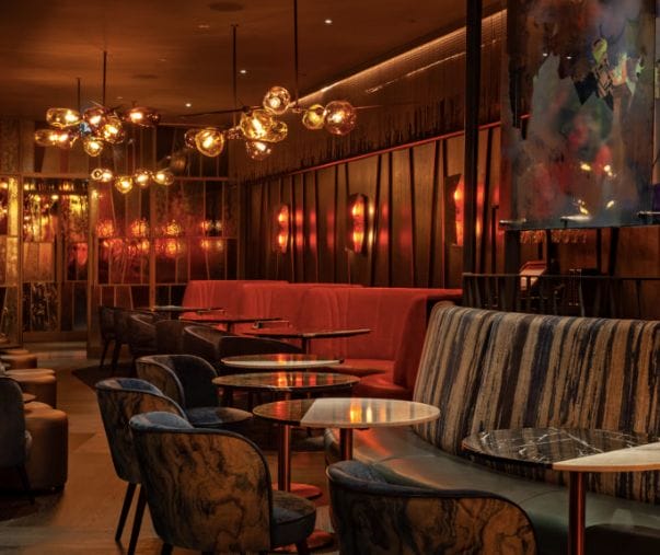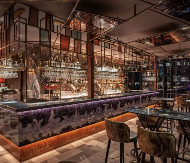 Inside is brutal yet sultry, urban yet opulent with reflective, scored and savaged surfaces contrasting with plush velvet finishes and marbleised floors.