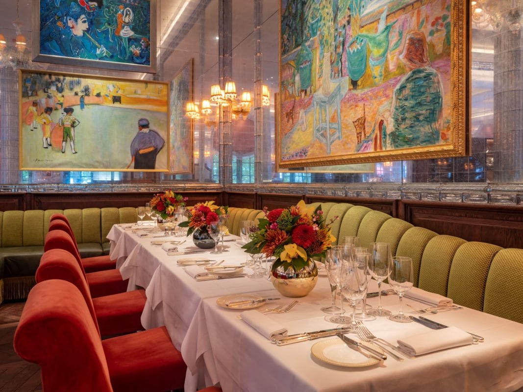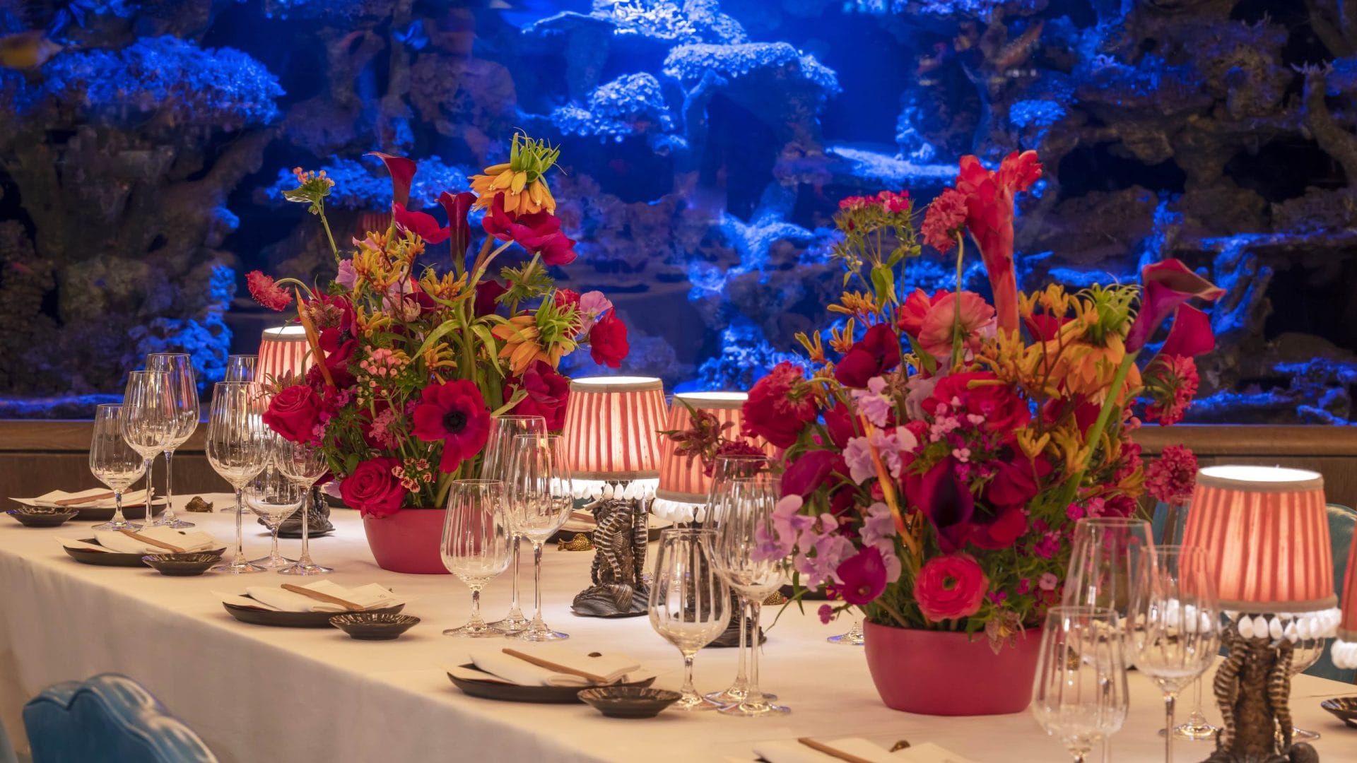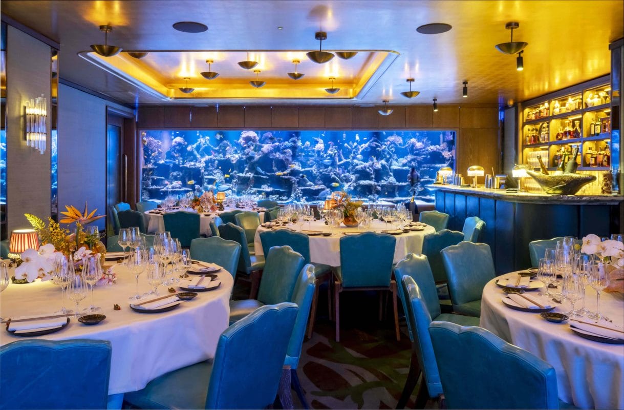 Designed by Martin Brudnizki Design Studio and decorated with art by Damien Hirst, Frank Gehry and Michael Roberts, the look and feel is mid-century glamour and opulence. The restaurant and bar is open seven days a week. A private dining space, The Coral Reef Room, is located on the lower ground floor and houses two of the largest live coral reef tanks in the world.